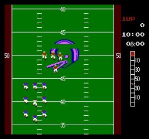 Much easier to understand than most games of the era, 10-Yard Fight is a simple football simulation. Your goal on the offense is to run the punt return as far as possible without getting bogged down by the defense attacking you. During a punt return your players will surround you phalanx-style and allow you to get as much yardage as possible before getting tackled. When on the offense you can run or pass the ball and attempt to score a touchdown. On defense, you select one of two defenders with either A or B and attempt to sack the quarterback or person in control of the ball.