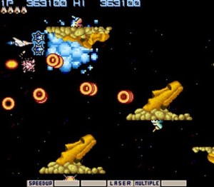 In 1985 Konami would release its own version of the shmup, Gradius, which added in the popular space ship protagonist and the concept of upgrade systems.  In Gradius your goal is to destroy ships attacking and shooting at you on a horizontal plane, but just like 1942 you are able to navigate the screen as you see fit.  As additional conflict, the levels themselves would be etched in different pathways and have walls, borders and formations that would attempt to crash your ship in addition to the enemies.  This title also established the boss battle as the conclusion of each level, making it important to upgrade your ship throughout the level for the challenge ahead.  It also established a power-up system – your ship could be upgraded with various weapons and add-ons provided that you collected enough power-ups and added them to the ship.  For those that have played Gradius, the ideal setup was usually to get two options (bulbs of energy that trail you and fire bullets), a force field, missiles that attack the ceiling/floor and top speed.  Many frequent players can accomplish this on the first level with little issue (or simply put in the Konami code on the pause screen in the NES version), however if you die in Gradius you will lose all add-ons and go back to a checkpoint area somewhere in the level.  This is why titles in the Gradius series and many other offshoots are considered “1 life” titles, meaning they’re exponentially easier if you can complete them in 1 life with all upgrades.  In  my eyes, and in the eyes of many others, the first official shmup was Gradius and sequels are still releasing today (Gradius Rebirth on WiiWare is technically the most recent, although Otomedius on the 360 touts itself a parody of Gradius).