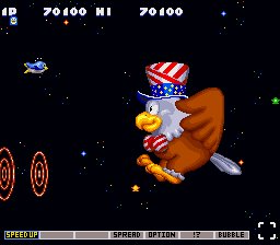 My favorite ongoing series has probably got to be the Parodius series (which may technically also include Otomedius), which many American gamers won’t be familiar with because we never received a single title in the US.  These titles are colorful, bubbly cartoon versions of a shmup that tend to have animals, large breasted anime girls and lots of US political jokes (probably why Konami never localized it here, despite releases in Japan and Europe).  In addition, it tends to parody the Gradius series (hence the hybrid name Parodius) while still retaining the power-up system and much of the challenge required to succeed (especially with the brutal recent Otomedius).  Just like the Gradius series, Parodius has made appearances in arcades and on most major consoles from the Famicom to the Playstation Portable.  More than likely this is the first example of the “cute ’em up”.